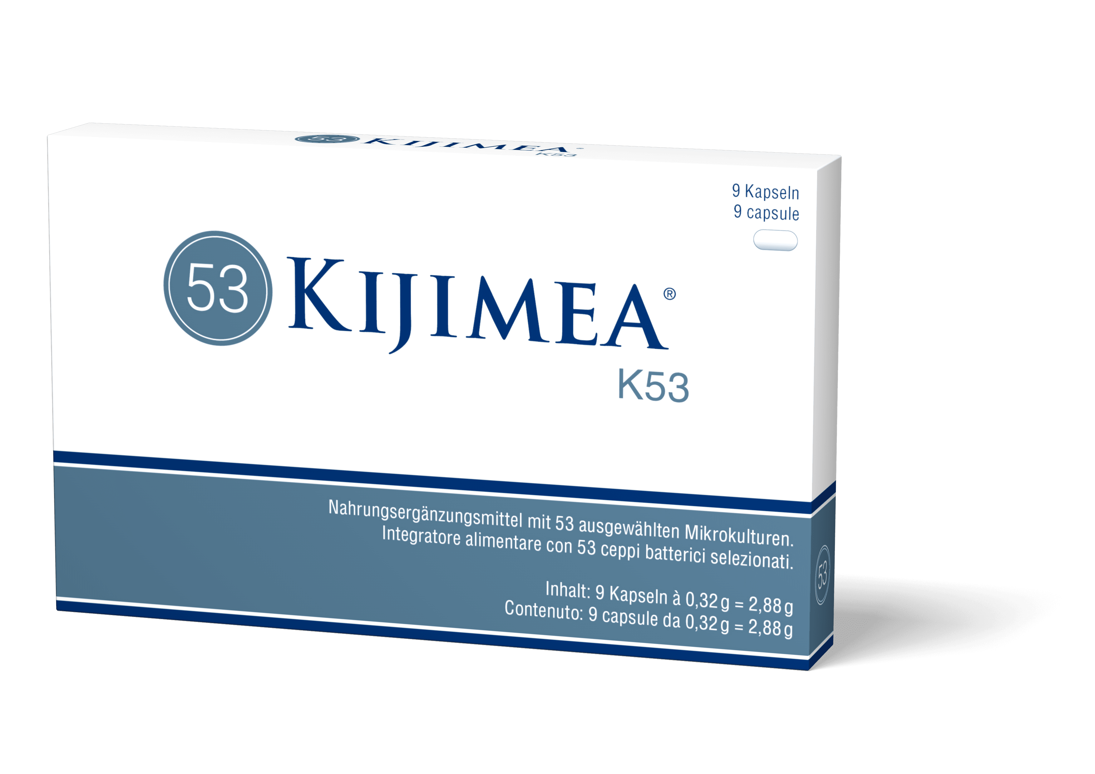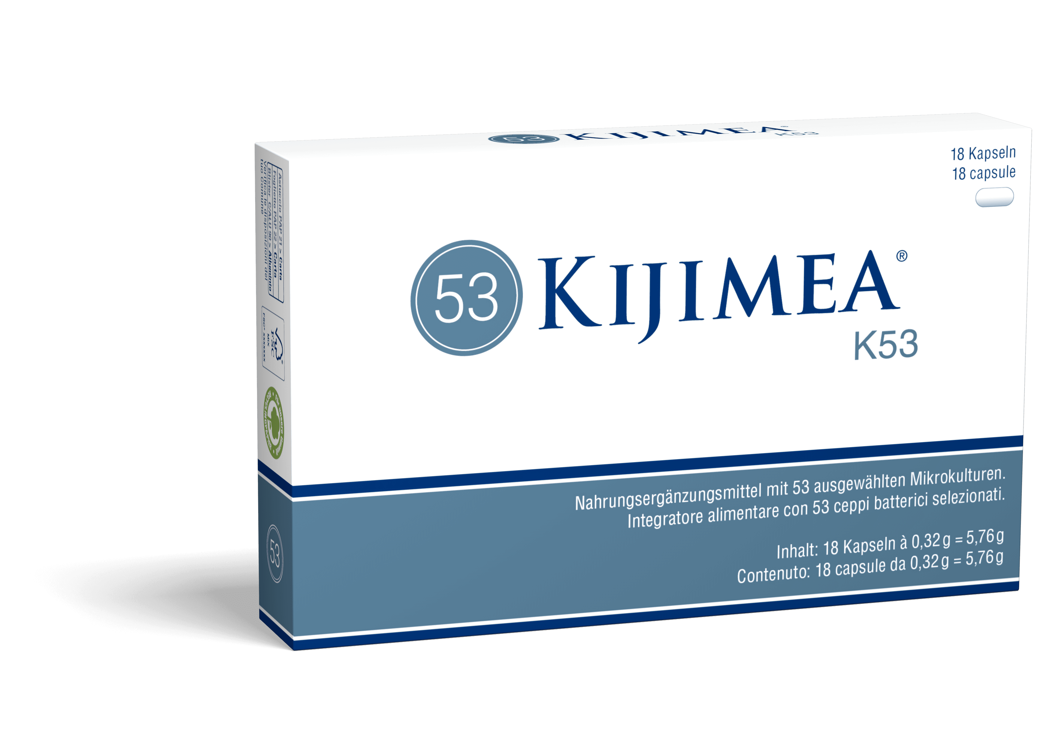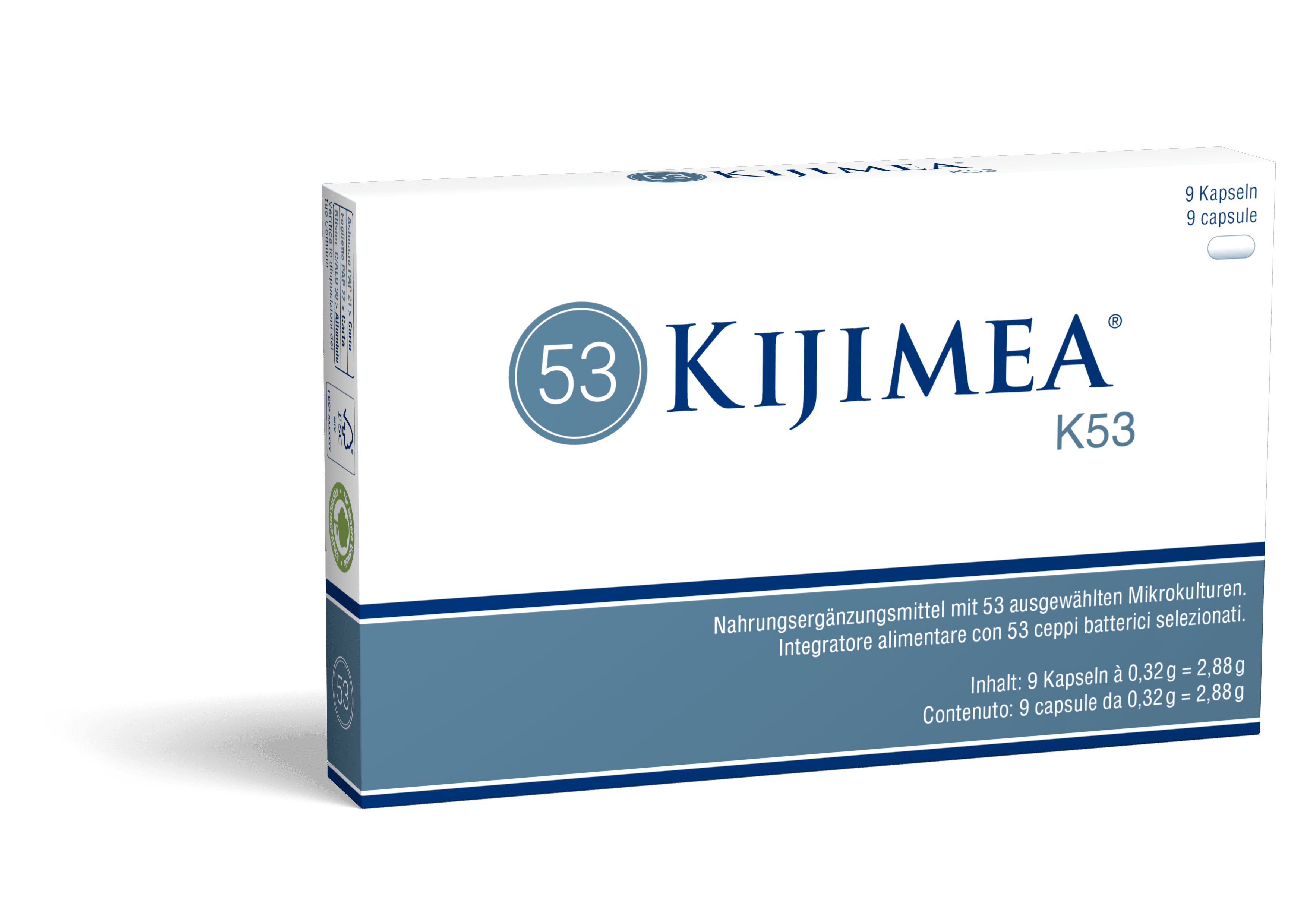 Kijimea® K53 è un integratore alimentare con 53 ceppi batterici selezionati, già presenti naturalmente nella flora intestinale dell´uomo.